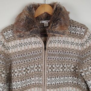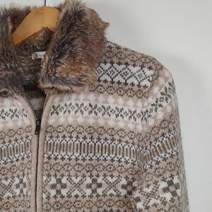 Susan Bristol Fair Isle Full Zip Faux Fur Collar Sweater Jacket Wool Size M