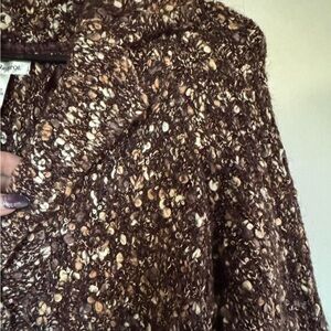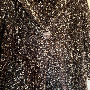 Warm knit cardigan with a mix of brown and cream tones. Single button closure. Alpaca, mohair blend , Ideal for cozy layering. Vintage style