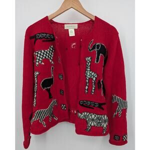 Susan Bristol cardigan sweater red knit animal applique zoo safari vintage 2000s novelty graphic button front whimsical retro womenswear
