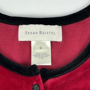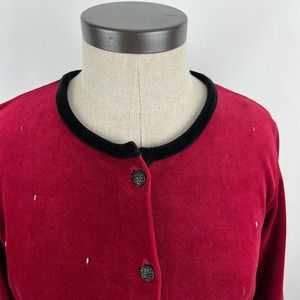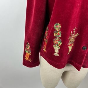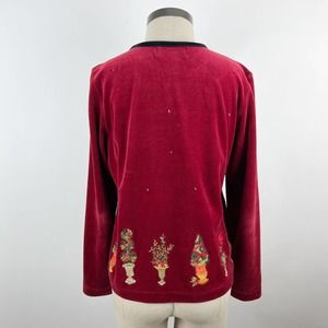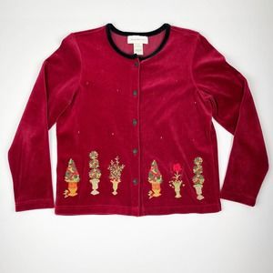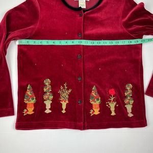 Susan Bristol Red Velour Ugly Christmas Sweater Cardigan Holiday Plants Trees