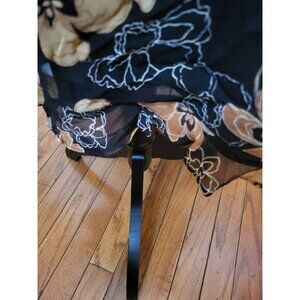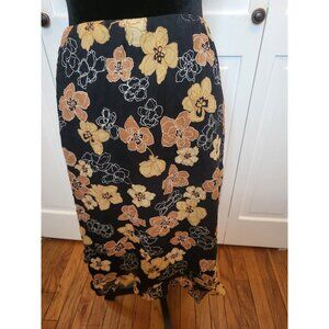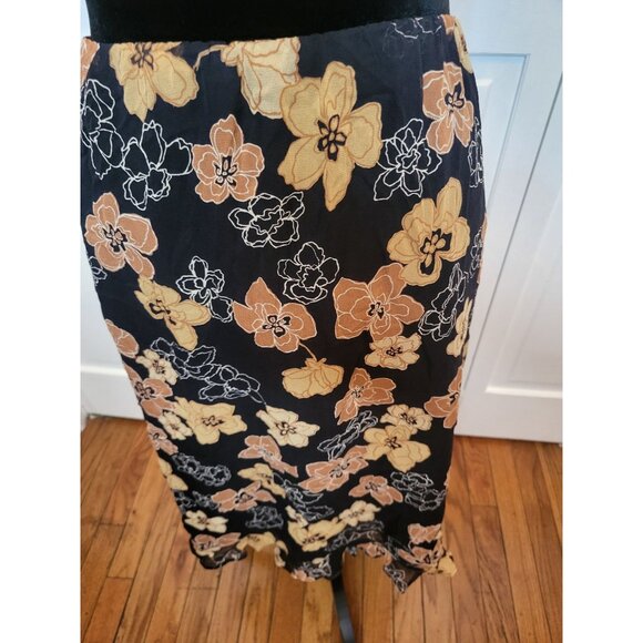 Susan Bristol brings a 100% silk slip skirt in a lovely floral pattern. Skirt features an elastic waist that also buttons and zips. Hem is adorned by flirty ruffle. Skirt is fully lined.