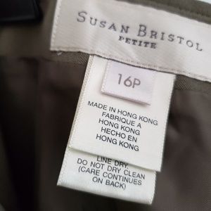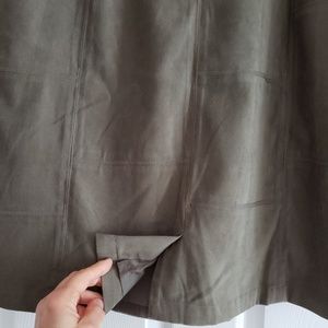 Pre-owned in good condition. Susan Bristol size 16P Khaki green colored Fuex suede skirt. Measurements laying flat are waist 16 inches, length 24.5 inches and slit in back measures 4.5 inches. One picture is close up to show you the square patch design. Please see photos. Questions welcomed.