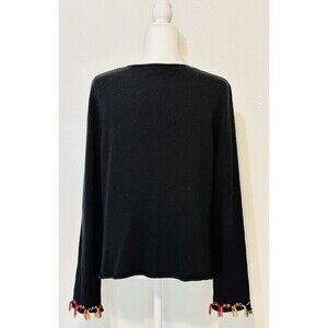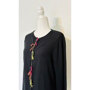 Elevate your wardrobe with this stunning Susan Bristol Women's Cardigan in size L. This vintage piece features intricate hand embroidery accents that add a touch of bohemian and retro charm to any outfit. The solid black knit fabric made of Ramie Cotton and mid-length cut make it perfect for any occasion, including travel and casual wear.