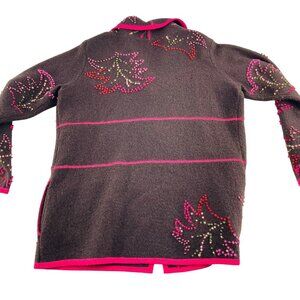 Susan Bristol Womens Large Hand Embroidered Wool Blend Brown Cardigan With Pink