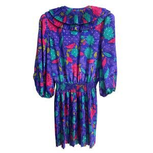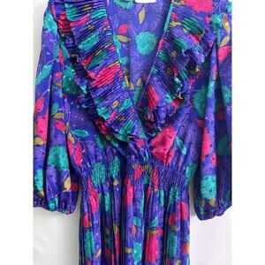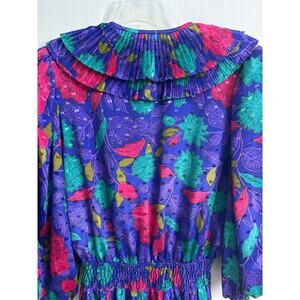 Susan Freis VTG 80s Floral Ruffed Smocked Waist Polyester Midi Dress Size M