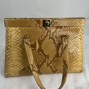 This is a beautiful Susan Gail Structured Python Shoulder Hand Bag. In excellent pre owned condition. A few almost unseen scuffs. Detachable shoulder strap of a 19” drop. Two handles of 6.5” drop. Goldtone hardware and top frame. Opens to a brown leather interior with a wall zip pocket. 10” x 8” x 4”. No odors.