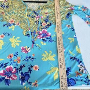 Susan Gravel Liquid Knit Paisley Floral Popover Top Size L Blue Pretty Office
