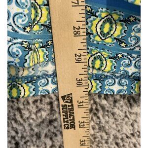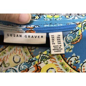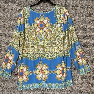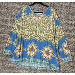 Susan Graver 2X Blue Yellow Paisley Floral Liquid Knit Blouse Top Tunic Boho