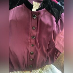 jacket with spring at the waist and black velvet on the neck and shoulders and black crystal buttons and zipper under the buttons, new jacket with pockets with label in grape and black color