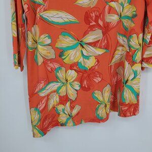 Susan Graver Asymmetrical Hem Coral Floral Flower Beachy Boho 3/4 Sleeve Shirt