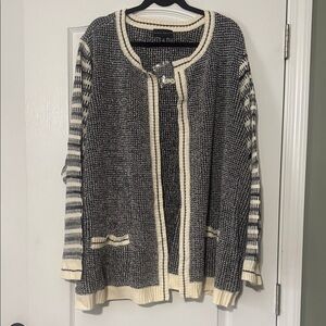 NWOT Stylish black and white knit cardigan with striped sleeves. Perfect for layering and great work attire. Can you worn during, fall, winter and cool spring days.