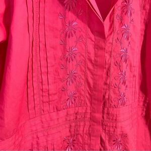 Susan Graver Blouse Large Pink Button Up Pleated Flower Embroidered 3/4 Sleeves