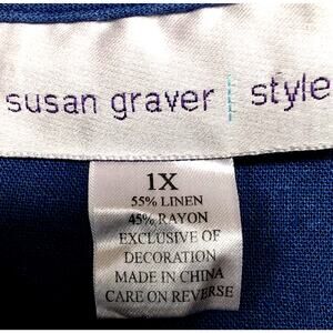 Susan Graver Blouse Top Womens Plus Size 1X Blue Linen Blend Embroidered Boho