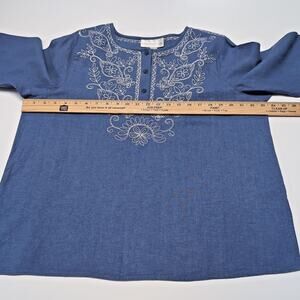 Susan Graver Blouse Top Women's Plus Size 1X Blue Linen Blend Embroidered Boho