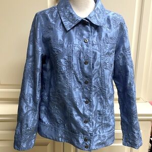 Susan Graver Blue Dupioni Texture Satin Floral Embroidery Jacket Coastal Grandma