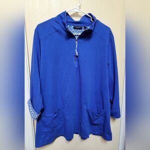 Stylish blue pullover with a quarter-zip design. Features a patterned collar inside and cuffs that fold to have print or not. Perfect for casual wear.