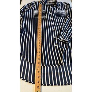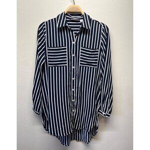 Susan Graver Button Down Shirt Tunic Blouse Hi Low Striped Sheer Womens 4 Coastal Nautical Beachy Blue White
