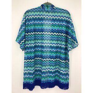 Susan Graver Cardigan Fringe Wrap Chevron Print Blue Green Small