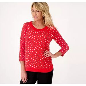 Feel effortlessly chic in this Susan Graver tunic, crafted in soft liquid knit with playful polka dots, bold color blocking, and tulip hemline. Semi-fitted with 3/4 sleeves and smooth drape for all-day polish. Perfect for office wear, casual dinners, or weekend outings. A versatile wardrobe gem.