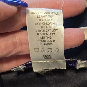 Susan Graver Style embroidered jacket in navy blue size small. Made from a soft stretch polyester blend fabric with a smooth polyester lining and structured shoulder pads for shape. Features a button front closure, pointed collar, and long sleeves. Beautiful multicolor floral embroidery decorates the front and sleeves, adding a touch of elegance and texture. Designed with a straight hem and a lightly tailored silhouette for a polished look. Material: shell 97% polyester, 3% spandex; lining 100% polyester. Machine wash cold, tumble dry low. New With Tags
