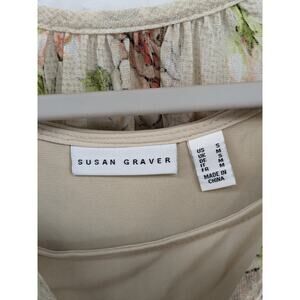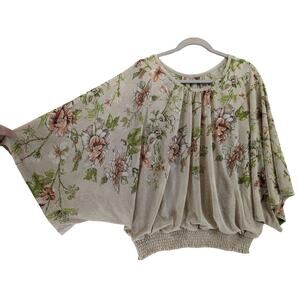 Susan Graver Floral Blouse S Cream Loose Fit Batwing Top Crew Elastic Hem Office