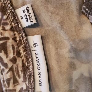 Susan Graver Geo Print Top in very neutral colors. Abstract animal print trim. Ruching at bustling for flattering fit. 95% poly 5% spandex for maximum comfort. Size Medium.