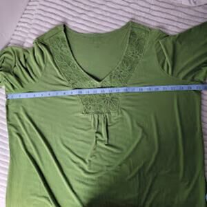 susan graver, #embroidered top, #floral blouse, green top, plus size top, #1X, #boho top, romantic style, RN 87935, pullover blouse, casual wear, spring fashion, soft fabric, relaxed fit, feminine style, floral embroidery, modest top