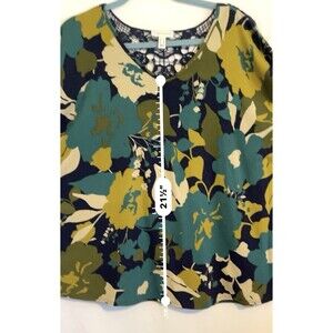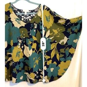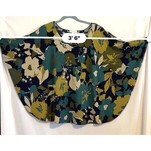 Beautiful Susan Graver knit, macrame, pullover poncho. This is soft stretch in beautiful green, navy blue, yellow and beige. The floral and leaf design along with the knit material, make for a great transition piece from summer to fall and winter.
