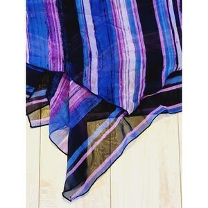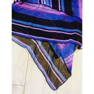 Elevate your wardrobe with this stunning Susan Graver top, perfect for any occasion. The purple, blue, and black striped chiffon material adds a touch of elegance to the tunic style blouse.