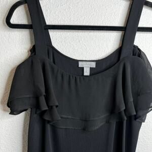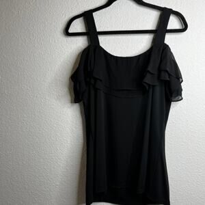 Features: dyed-to-match tiered ruffle front and back ruffle trim at neck, cold-shoulder design, straight bottom hem