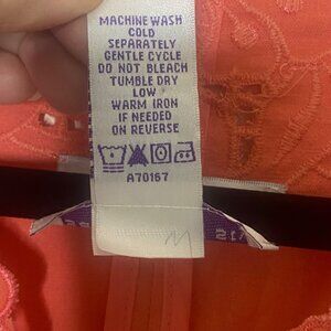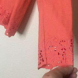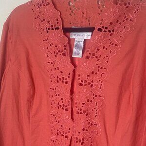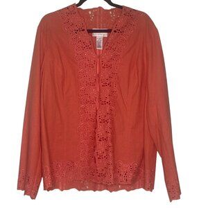Susan Graver Linen Blend Top X-Large Coral Floral Embroidery Long Sleeves