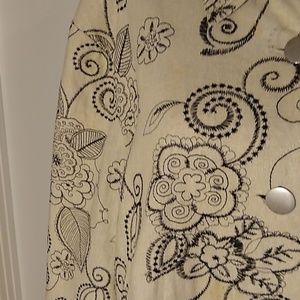 Flat seam shaping front and back with straight back yoke and flat bottom band. Lined,. Long sleeves. Black embroidery. Pitt to Pitt 23". Shoulder to hem 27. Arm inseam 18"Black pants, tee and open it up and this will be your go to outfit.