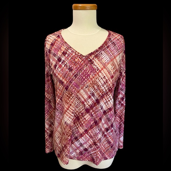 Susan Graver Liquid Knit Deconstructed Plaid Print V-Neck Long Sleeve Top. Polyester / Spandex. Size Small.