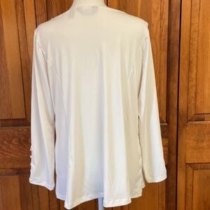 Susan Graver tunic top. 26” length and 21” armpit to armpit. Wrist length embellished sleeve (5 square plastic buttons) with bateau neckline. Liquid knit. Creamy ivory white with mildly flared hemline. Preowned but worn once. No flaws. Size MP