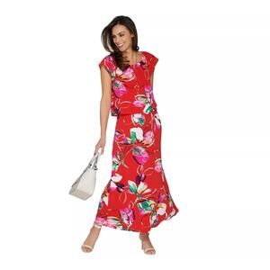 Gently worn EUC Susan Graver red floral maxi dress in soft, stretchy Liquid Knit fabric. Features a tank-style base with a lightweight, draped overlay that gives the illusion of cap sleeves — feminine and flattering! Pullover style with flowy maxi-length silhouette. Perfect for summer events, vacations, or casual weddings. Travel-friendly fabric, easy to pack, and wrinkle resistant.