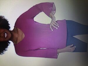 Fabrication: Liquid Knit, soft, flattering knit with a smooth feel and fluid drape.. V-neckline, 3/4–length sleeves with pleated chiffon cuffs, straight bottom hem.