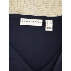 The product is a Susan Graver navy top in size M, designed for travel and office comfort. This faux wrap blouse from the LagenLook collection offers a stylish yet practical option for the modern woman. With its versatile navy color and comfortable fit, it can be worn in any season year-round, making it a convenient and timeless addition to any wardrobe.
