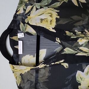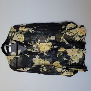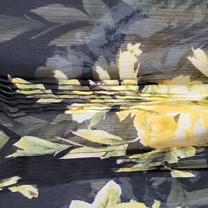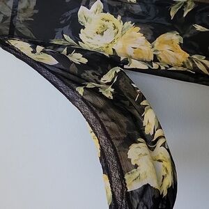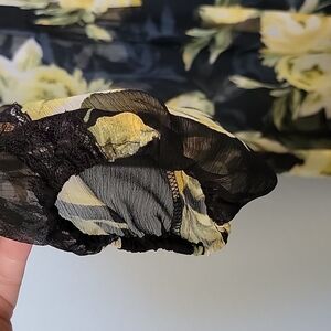 Black with yellow and green florals. Has a pleat front. Sleeves has a lace inset going down the length of the arm. Elastic at the end of the sleeve. Long sleeve length. Blouse is sheer. Lightweight. Doesn't stretch. Crinkle texture. Great condition. oversized, relaxed fit. Office, workplace, dinner, date night, garden, mature, classy, flirty, goth, boho, dressy, botanical,fall, autumn, spring, moody