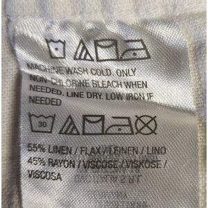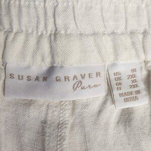 Susan Graver PURE 1X Linen Blend Pull-On Crop Pants with Button Detail at Leg opening. Elastic waist. Angled front pockets. Rise at waist. Semi-fitted. Pre-owned in excellent condition. Made in India.