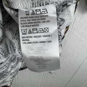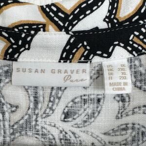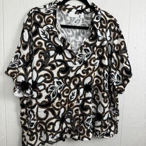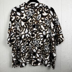 Susan Graver PURE Printed Linen Blend Elbow Sleeve Camp Shirt Black Tan Size 1X