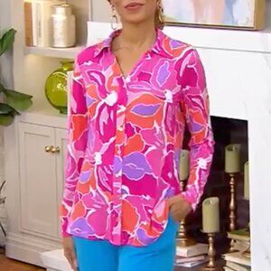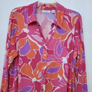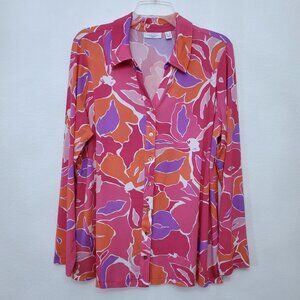 Susan Graver Passport Floral Printed Liquid Knit Button Down Women's Shirt Large