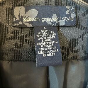 Keywords: Susan Graver, women's blazer, black jacket, business attire, textured print, cotton blend, polyester lining, button closure, long sleeve, pre-owned blazer.