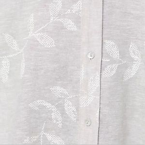 Features: button-front closure, collared, allover printed, side-seam pockets, 3/4-length sleeves, notched cuff details, side slits