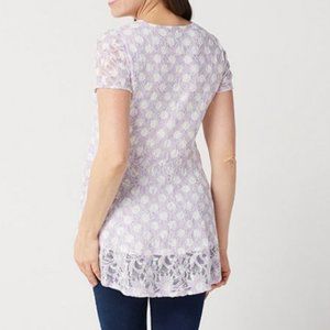 Features: allover lace print, circle neckline, short sleeves, high-low hem with peplum back, lined