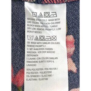 0346B - Susan Graver, QVC, above knee dress, US 1XP. (UK 2XLP, DE KG5, IT 2XLP, FR XXLP) Navy blue background with floral tulip pattern and leaves in orange, red, green. Unlined. 10” Side slits at hem. Stretchy, button down front, shiny gold square buttons with rounded edges.v-neck, Long sleeve. Made in China.