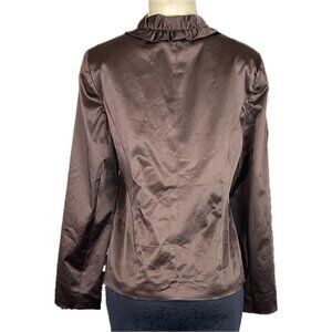 ITEM: Susan Graver S Espresso Brown Satin Ruffle Down Front Lined Long Sleeve Jacket