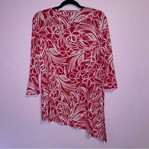 Stylish red tunic with white floral pattern. Asymmetrical hem. 3/4 sleeves. Perfect for casual wear.
