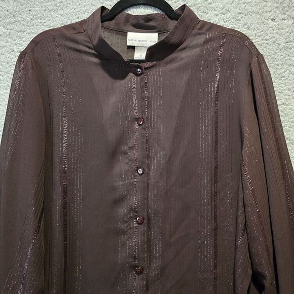Susan Graver Sheer Blouse Womens 1X Brown Metallic Button Down Sparkly Top Office Siren