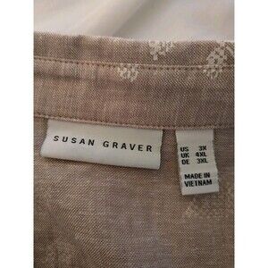 The Susan Graver Shirt is a stylish women's top in size 3X, featuring a beige and white floral leaf pattern. This linen blend blouse has a collared neckline, 3/4 sleeves, and a button closure for a classic and fitted look. Perfect for travel, parties, or casual occasions, this top is machine washable and has a woven fabric type with accents like buttons and pockets. Ideal for the summer, fall, and spring seasons, this top is a versatile and elegant addition to any wardrobe. Perfect condition--like new!