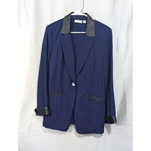 Susan Graver Size 12 Ponte Knit Blue Blazer with Black Faux Leather Trim Career